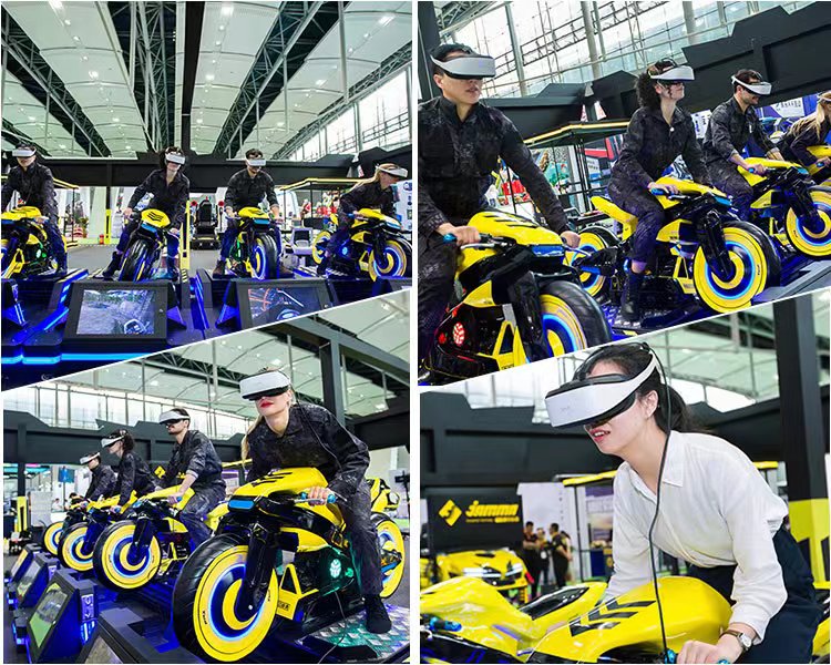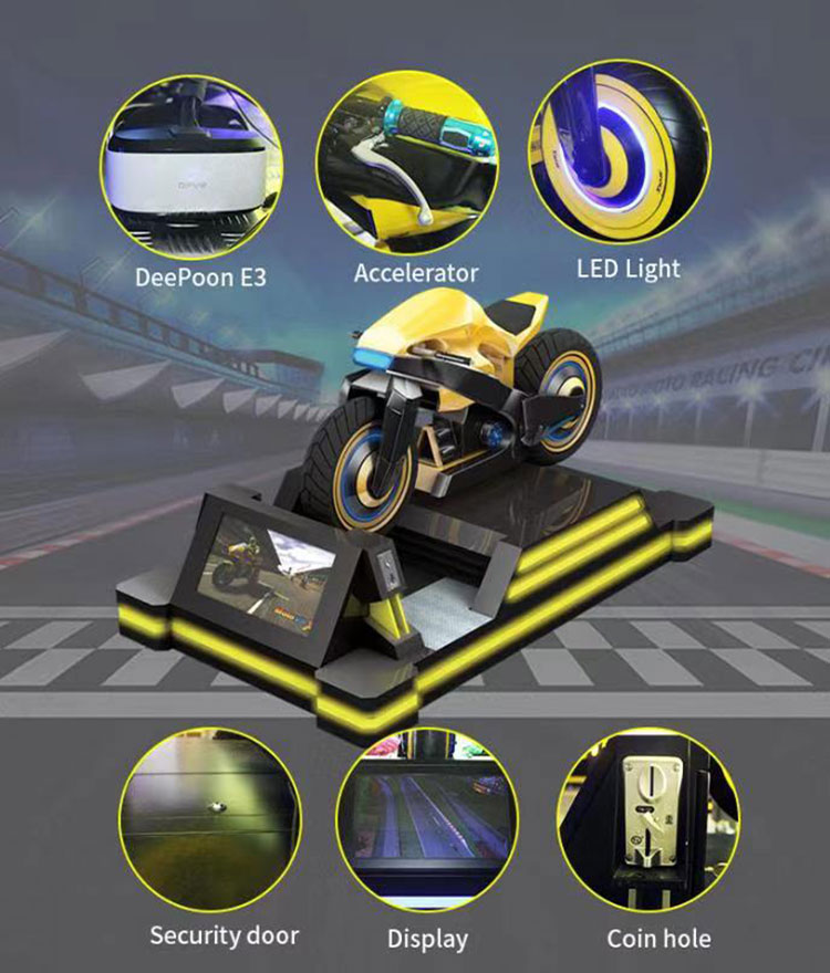 VR moto is consist of moto and VR glasses,it is combines the virtual and reality technology,make them feel like driving in the real world when players experience the game.Players wear the Deepoon E3 glasses,who will see the 360 degree view,and enjoy the amusing game.There are four different racing track,like dinosaur track,highway track,Sci-fi track,circle track.Different track,different experience feeling.Player will immersive in the games,and the game will bring much happy to them.